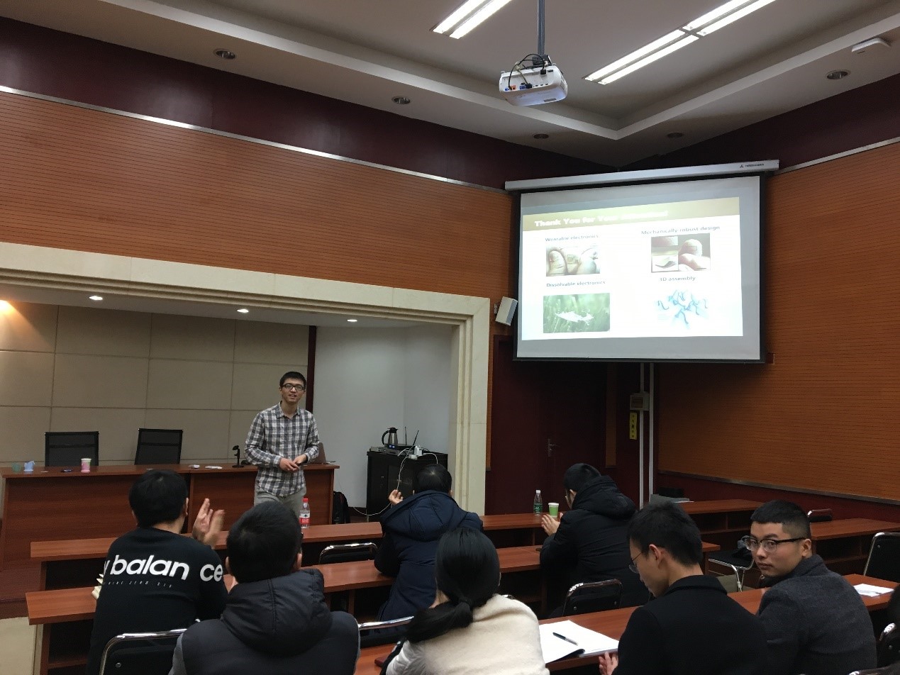 应公司袁江宏副教授的邀请,2018年12月19日下午,美国宾夕法尼亚州立大学程寰宇博士来公司进行学术交流,并作了题为“Dissolvable Tattoo Electronics for Biomedicine”的学术报告。程博士首先综述了柔性电子相关的前沿研究,包括先进转印技术、生物复合材料设计、多级微结构设计、三维组装等;接着重点介绍了可降解柔性电子的概念以及他近年来在可降解柔性电子方面的创新研究成果,包括可降解电子器件的力学设计及结构优化、可降解生物医疗传感技术、可降解集成电子等;最后对柔性电子尤其是可降解电子在人体健康监测及医疗等方面的潜在应用进行了展望。该报告引起了公司师生的浓厚兴趣,现场气氛活跃、讨论热烈。报告结束后,公司袁江宏老师与程寰宇博士就软材料与柔性结构设计等前沿课题进行了深入交流,并探讨了今后合作研究的可能性。程寰宇博士此行增进了TapTap点点官方网站与国外知名高校之间的学术交流与合作,促进了公司的科研发展。