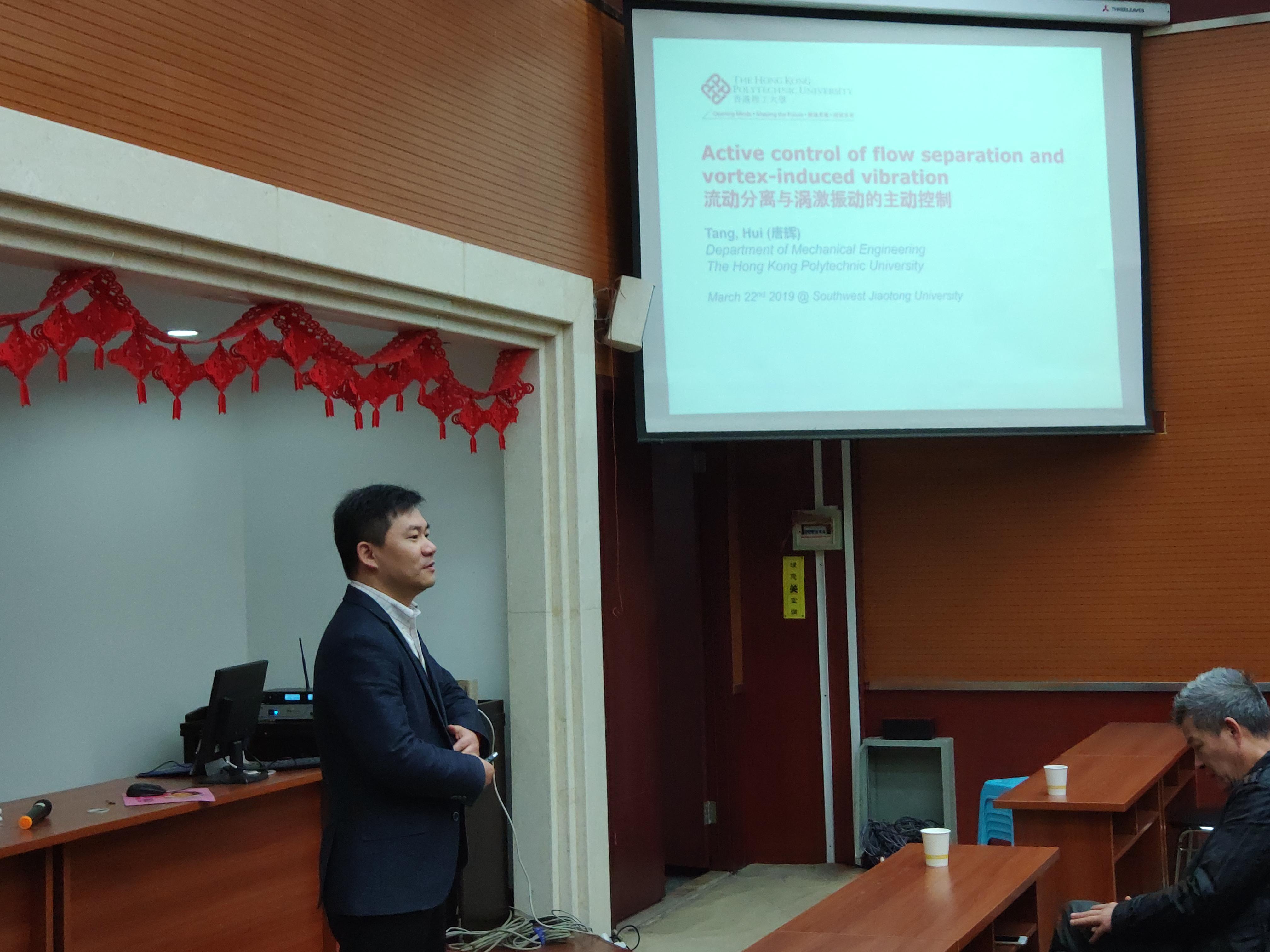 应TapTap点点李鹏老师的邀请,香港理工大学唐辉副教授,于2019年3月22日在九里校区行政楼240会议室,进行了题为“Active Control of Flow Separation and Vortex-induced Vibration”的专题讲座,并与3月22日下午在振动中心参与流固耦合课题组的组会讨论。公司研究生、博士生以及流固耦和相关方向导师参与了报告及交流。