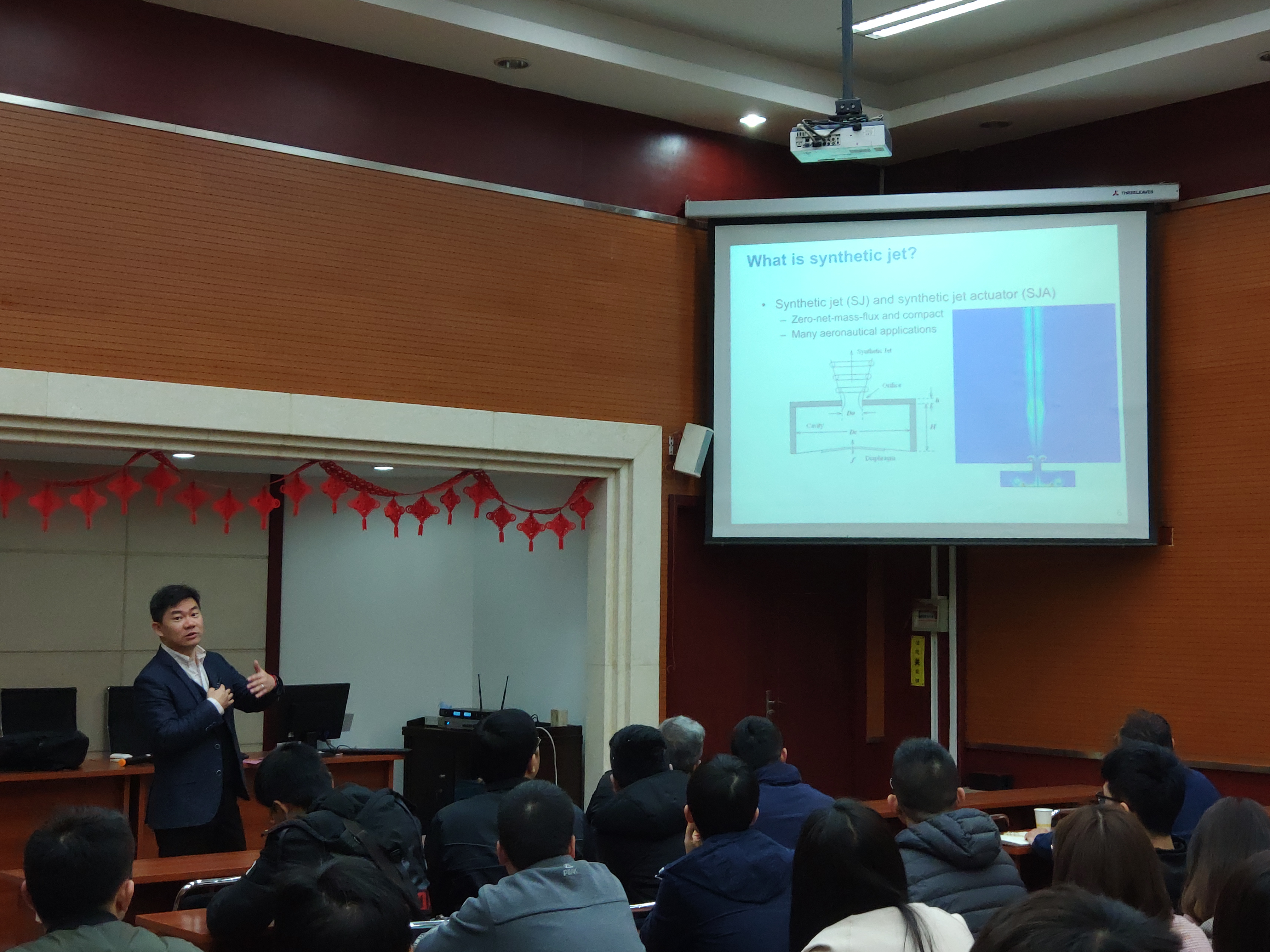 此次讲座,唐老师首先对主动控制在气流分离延迟和涡激振动抑制中的应用进行介绍。所谓主动控制,即对现有的流体系统输入少量能量,以达到控制振动的目的。相对于被动控制更具主动性、自适应性及按需性。唐老师主要提出合成射流和迎风面呢吸入背风面射出两种主动控制方法,并结合三个实例进行相关介绍。唐老师同时对扑翼结构的相关研究进行介绍,对于扑翼结构和能量采集,水洞实验等方面进行了深入探讨。