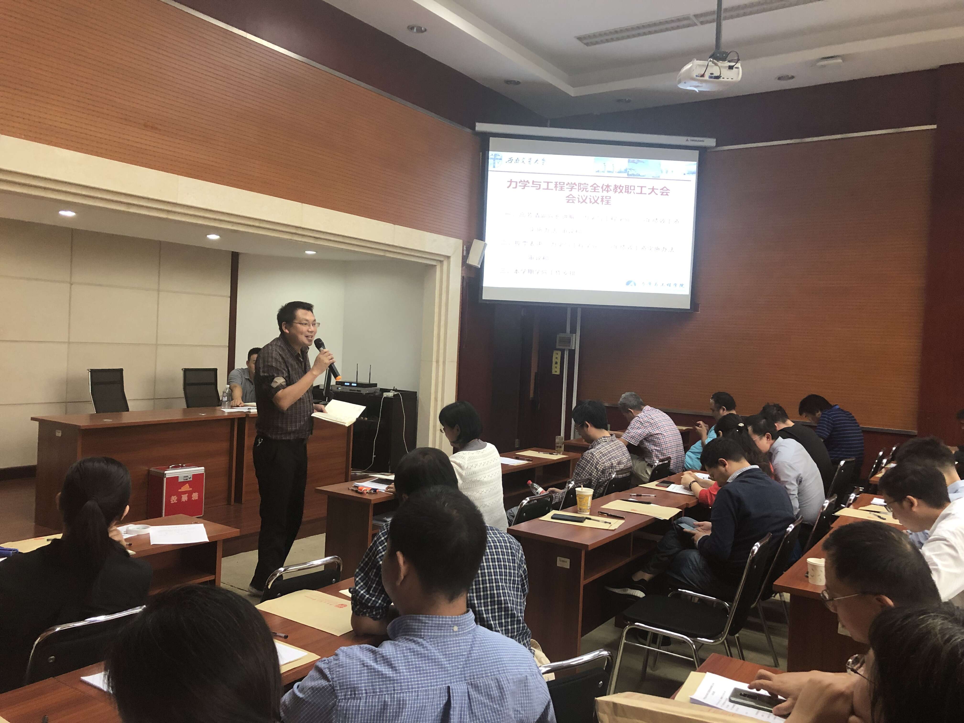 在接下来的会议中,高芳清副经理对近期学院教学团队工作室使用情况进行了通报和要求。阚前华副经理介绍了“力学拔尖班”报名情况和研究生招生、教学的相关工作安排。李翔宇副经理通报了近期相关学术会议、自然科学基金、“创源大讲堂”等工作的进展情况。工会主席范晨光通报了近期学院歌咏比赛、植树活动等工作安排。