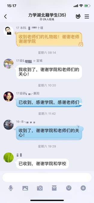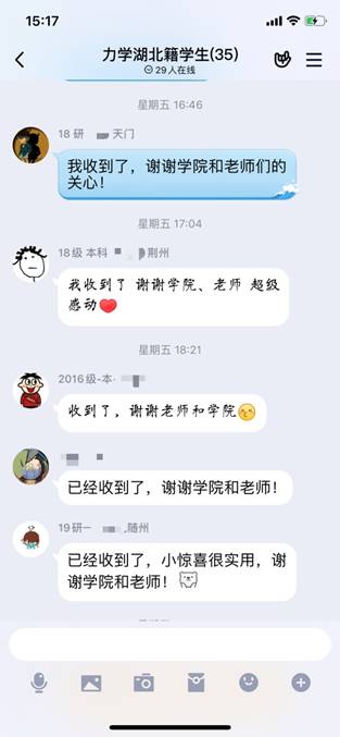 收到学院寄来的这份“防疫暖心包”,同学们感到既惊喜又暖心。2019级本科生周同学发出真挚感言:“自从步入交大以来,太多次感受到了学院的温暖。彼时,大家都在学校,学校的照顾自然面面俱到;而今,纵使远隔千里,学院暖暖的关心和问候也不会缺席,让我们这些在鄂学子感受到浓浓的温情!谢谢老师们!”2019级研究生柳同学同样表示:“身处疫情严重的湖北,收到学院的礼物真实感受到了学院老师们对湖北学子的挂念和关怀,谢谢老师,感谢学院!”2017级本科生王同学说:“收到学院老师们寄来的包裹那天,感到格外的感动,即使身在湖北,依然能够得到老师们的关心和祝福,一封信一包口罩,不重的包裹却让我感受到了春天的暖意,感谢学院的老师们,您们辛苦了。”