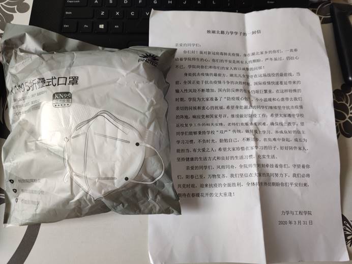 4月1日,学院为30名湖北籍员工寄送“防疫暖心包”,包裹里不仅有防疫物品,还有一封写给湖北学子们的信。在信中,学院向湖北同学致以诚挚的问候,表达了浓浓的思念与牵挂,让他们感受到了来自学院的温暖,给了大家战胜疫情的勇气和信心。