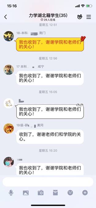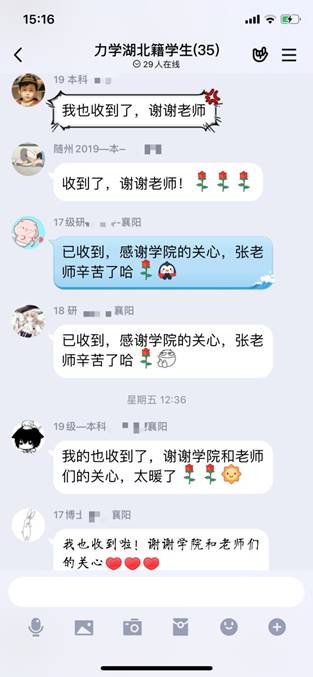 自疫情爆发以后,学院始终关心、关注着每一名湖北籍学子的情况,公司党政班子专题研究关心关爱湖北籍员工的工作,学院副书记第一时间电话联系每一位湖北籍同学,关心了解同学们及家人生活情况;各年级辅导员也利用电话、微信和QQ与他们保持密切联系和良好沟通,并组建了湖北籍员工QQ群,确保了解在鄂学子的健康状况、心理状态,让员工知道学院是他们的坚强后盾。