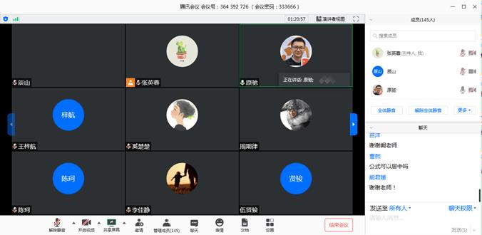 5月18日晚19:30,力学学院开展了2020届毕业生“建功立业新时代”云上动员会暨返校工作会。会议由学院团委副书记、研究生辅导员张英蓉老师主持,学校招就处就业管理科科长陈曦轶、学院副经理阚前华、公司党委副书记孔祥彬、学工组副组长杨婧、2016级本科生辅导员向金兰以及学院2020届的全体本、研员工参加了本次会议。