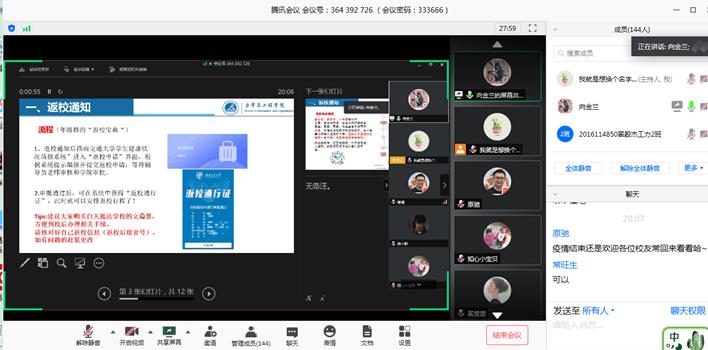 接着,研究生辅导员张英蓉老师、本科生辅导员向金兰老师分别强调了毕业、返校等相关事宜,尤其是对员工返校后的入校流程、安排、安全注意事项等进行了详细说明。